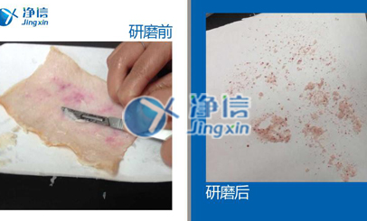 通過研磨脫脂豬皮樣品,對樣品細(xì)胞進(jìn)行提純,研究其藥物作用。破碎過程中脫脂豬皮組織需要在低溫中進(jìn)行,樣品本身較為堅(jiān)韌,處理過程比較繁瑣,所以客戶選擇使用上海凈信冷凍研磨儀進(jìn)行前處理破碎。