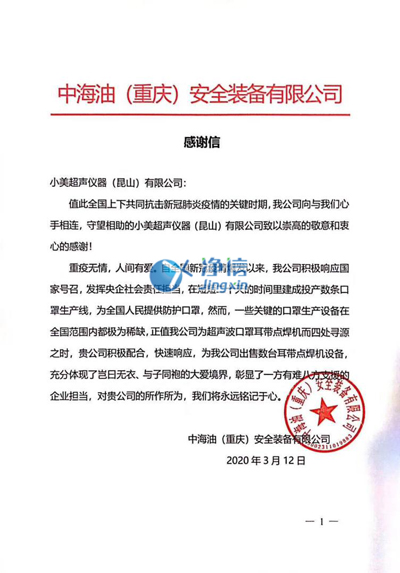 是的,這是我們小美超聲!抗擊疫情,我們不是旁觀者。我們與時間賽跑,推掉別的訂單,爭分奪秒加班加點的為中海油生產口罩耳帶點焊機。員工24小時兩班倒,靠吃泡面節(jié)省時間。力求在很短的時間內把口罩機交到中海油的手上,大大提高了其口罩生產的產量。
