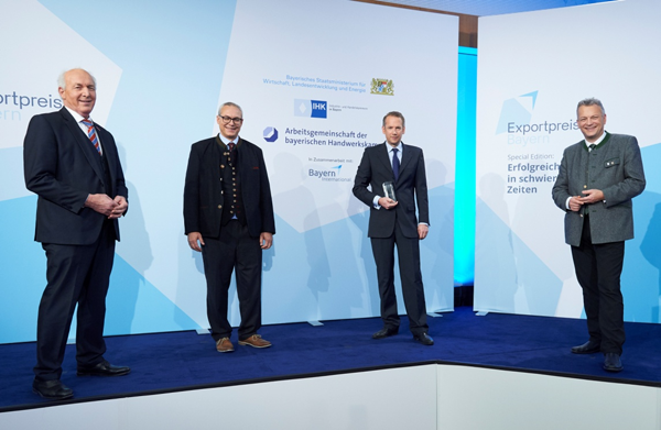 自2007年以來(lái),巴伐利亞州經(jīng)濟(jì)事務(wù)、區(qū)域發(fā)展和能源部、巴伐利亞工商會(huì)協(xié)會(huì)、巴伐利亞手工藝商會(huì)協(xié)會(huì)與拜仁國(guó)際合作頒發(fā)了“巴伐利亞出口獎(jiǎng)”。該獎(jiǎng)項(xiàng)面向活躍于國(guó)際業(yè)務(wù)成功的中小企業(yè)。