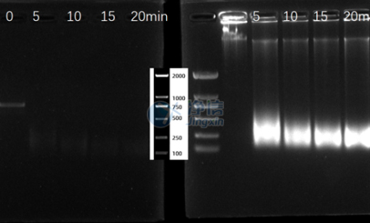 3.相同處理時(shí)長(zhǎng)的樣本混合后,瓊脂糖凝膠電泳檢測(cè)結(jié)果: