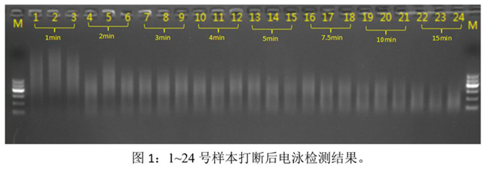 實驗結(jié)果表明:(1) 隨著打斷時間的增加,打斷片段的大小也隨之變??;(2) 相同打斷條件下,打斷效果的重復性和均一性良好。