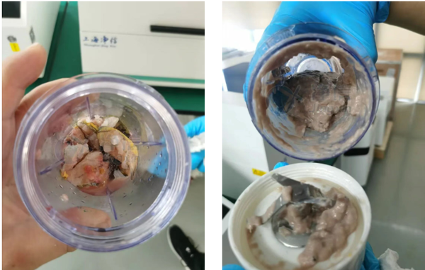 本次實(shí)驗(yàn)使用上海凈信的平行研磨儀對(duì)魚肉研磨后的肉泥非常均勻,無(wú)大塊顆粒,魚皮也被研磨充分,實(shí)驗(yàn)效果非常好,用戶很滿意。