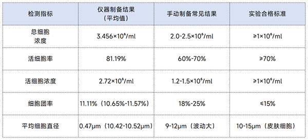 實(shí)驗(yàn)結(jié)果也印證了這一點(diǎn):儀器制備的懸液濁度僅 0.89.細(xì)胞平均直徑 10.52μm(符合皮膚細(xì)胞正常范圍),后續(xù)做流式檢測時(shí),雜質(zhì)干擾信號比手動(dòng)法低了 18%。