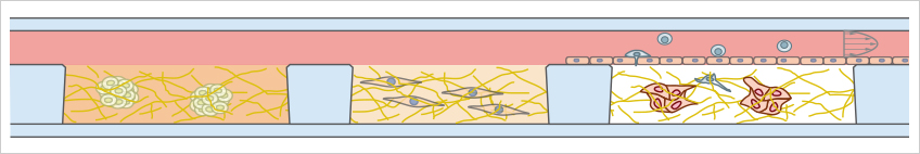 For physiological rolling, adhesion, and transmigration approaches, the endothelial cell layer can be supplied with suspension cells on the luminal side and target cancer cells on the basal side. Optionally, defined shear stress can be applied.