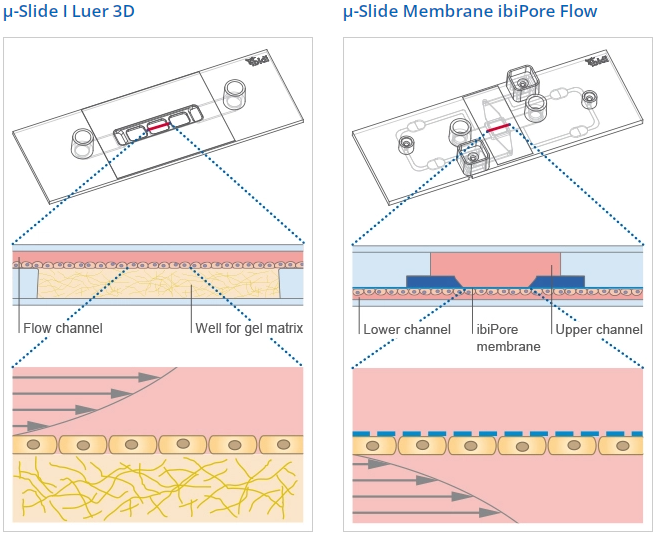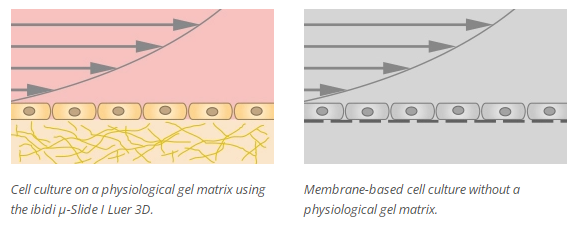 Using this method, an in vivo-like functional monolayer (e.g., an endothelial barrier) can be established on the gel matrix without any artificial filters or membranes involved. The μ-Slide I Luer 3D is especially designed for the simulation of blood vessels using endothelial cells.