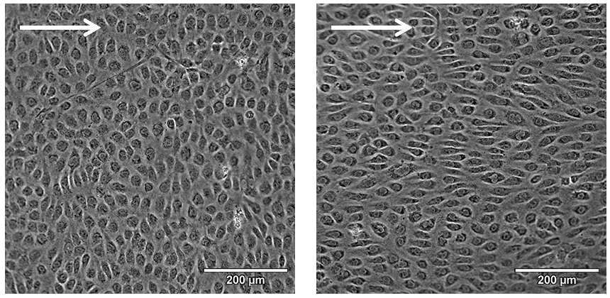 Phase contrast microscopy of HUVEC after culturing them under flow at 10 dyn/cm2 for 2 days (left) and 5 days (right) on a Collagen Type I rat tail (2 mg/ml). Note the cobblestone-like cell morphology after 5 days of culture under flow. 20x objective.