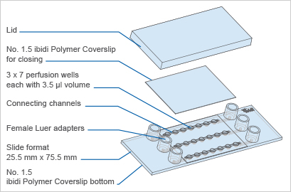 μ-Slide球體灌注是用于培養(yǎng)自由漂浮的3D聚集體的專用流動(dòng)室。它由3 x 7平底孔組成,這些孔通過(guò)上方的通道連接。每個(gè)孔形成自己的壁,在此培養(yǎng)標(biāo)本。