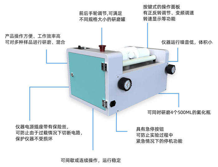 儀器運(yùn)行噪音低,體積?。?br/>可同時(shí)研磨4個(gè)500ML的氟化瓶;